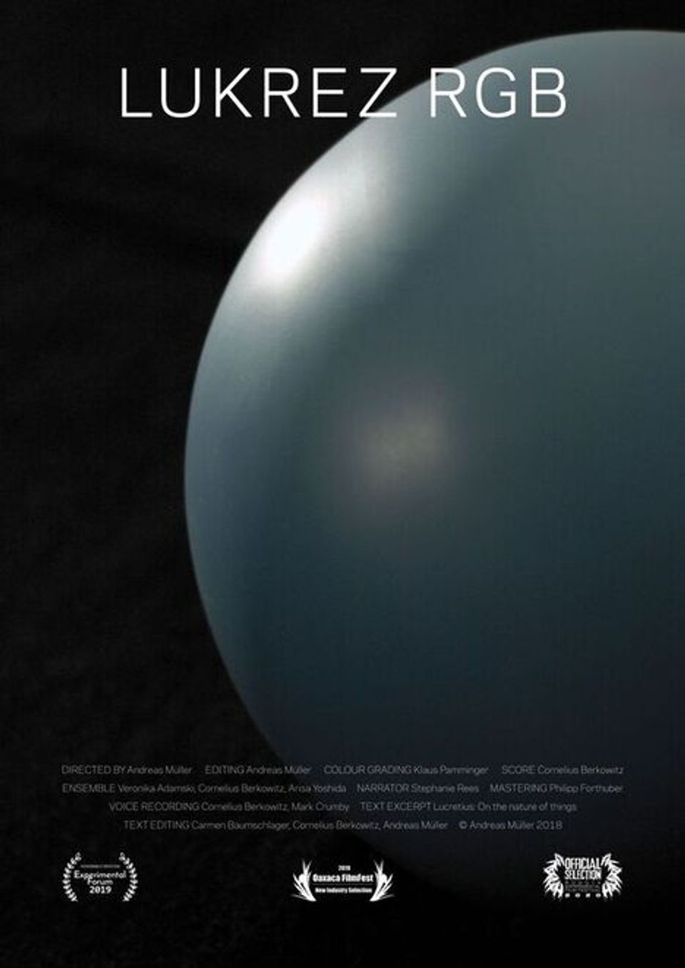 "LUKREZ RGB" interprets Lucretius’ revolutionary theories on the origin of our planet, the celestial bodies and the universe, with intense images. Written over 2,000 years ago the text, which the film is based on, unfolds a lost perspective, that seems outdated from today's point of view. A thought pattern that seems incompatible with our modern research methods and theories, but yet it anticipates the findings of the present sciences. In Lucretius’ text this is shown in his doubt about a higher intelligence, that controls the formation of the universe. A distinction between mind and matter is alien to him, both concepts rank on the same level. In doing so, he allows chance a decisive role in the process of creating the cosmos, whose elements are reduced to their corporeal components.